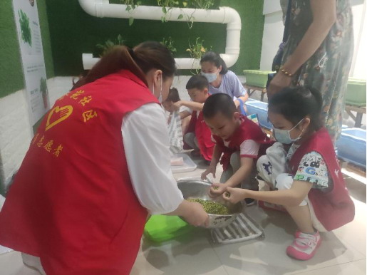 在“芽芽”微家志愿者的协助下,组织小朋友开展芽菜的育苗护苗活动,让他们在芽菜成长的过程中体验“当家人”的感觉。在“微家”志愿者吴利琴的帮助下,小朋友将托盘上铺好打湿的毛巾,将一颗颗浸泡好的绿豆平铺在毛巾上,再盖上一层湿毛巾,将培养托盘放到培养架上,一盘盘芽菜的培育就完成了。培养架上有已经发芽长好的芽菜,小朋友们认真的观察着,从志愿者的讲解中了解芽菜生长的过程。最后,小朋友们一起对培育好的芽菜进行了采摘。