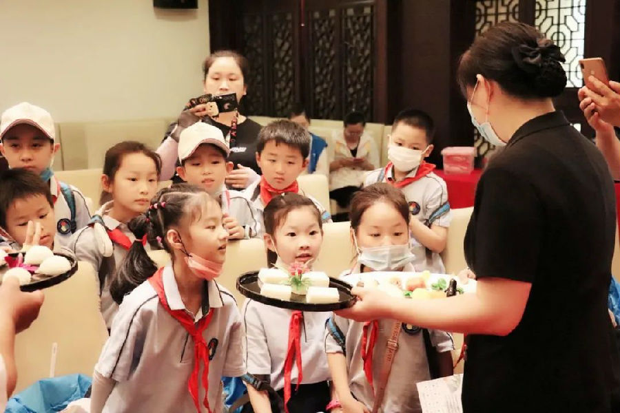 得月楼创建于明代嘉靖年间,传承苏帮菜点,名师荟萃,蜚声中外。来到得月楼,小营员们听老师讲述苏帮菜和苏式糕点的历史由来和传承故事,还品尝到了得月楼招牌糕点小方糕,品味苏式传统味道。