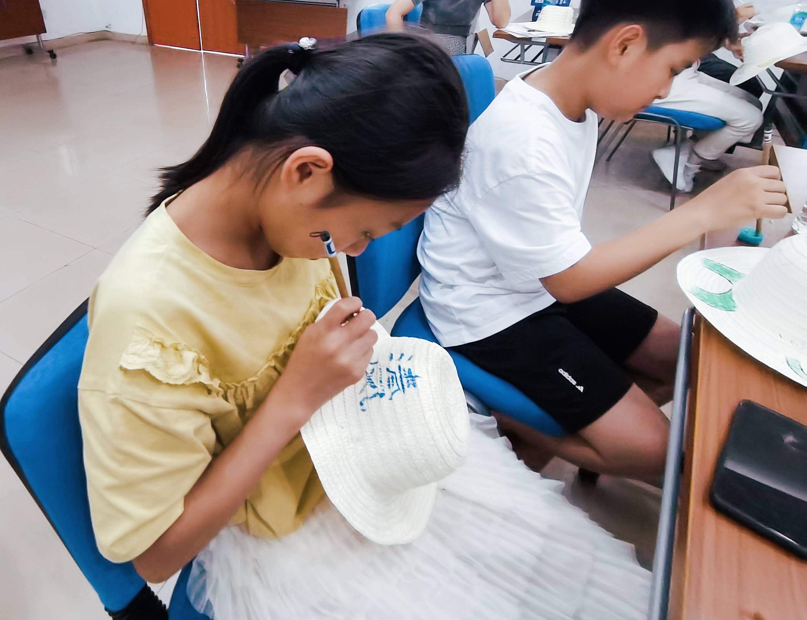 活动一开始,老师首先通过询问孩子们是否知道有关廉洁的诗句展开互动,“出淤泥而不染,濯清涟而不妖”,“无意苦争春,一任群芳妒”,“大雪压青松,青松挺且直”……一句句耳熟能详的诗句从孩子们口中说出,老师以此引出了今天的活动内容——亲子一同完成廉洁主题的遮阳帽绘制。老师先做示范教学,不多时一顶画有青翠竹节的帽子就完成了,孩子们看到成品后连连惊叹,纷纷动手开始和家长们一起绘画。在老师的指导下,一幅幅表达了孩子们自己对廉洁文化理解的作品终于完成了,夏日粉荷,寒冬腊梅,稚嫩的笔触流露出真挚的情感。