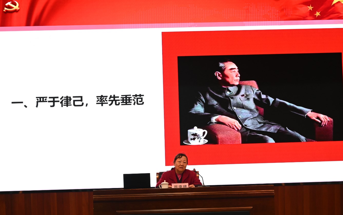 现场,周秉建以周恩来总理家风故事为主线,从“严于律已,率先垂范”“至亲者愈严”“伯父对我的教诲”三个方面回忆总理往事,感情质朴而真诚。周总理一生严于律己、清正廉洁、大公无私,为 家人立下了著名的"十条家规",比如:不许请客送礼,不许动 用公家的汽车,生活要艰苦朴素,在任何场合都不要说出与 总理的关系、不要炫耀自己,不谋私利、不搞特殊化,等等。 这些家规看似简单朴素,却蕴含着共产党人"不搞特殊化"的 政治本色和"天下为公"的崇高境界。严谨的家风以及严于律己、公私分明、从不搞特殊化、也绝不允许家人搞特殊的崇高品德和人格魅力深深感染了现场听众。