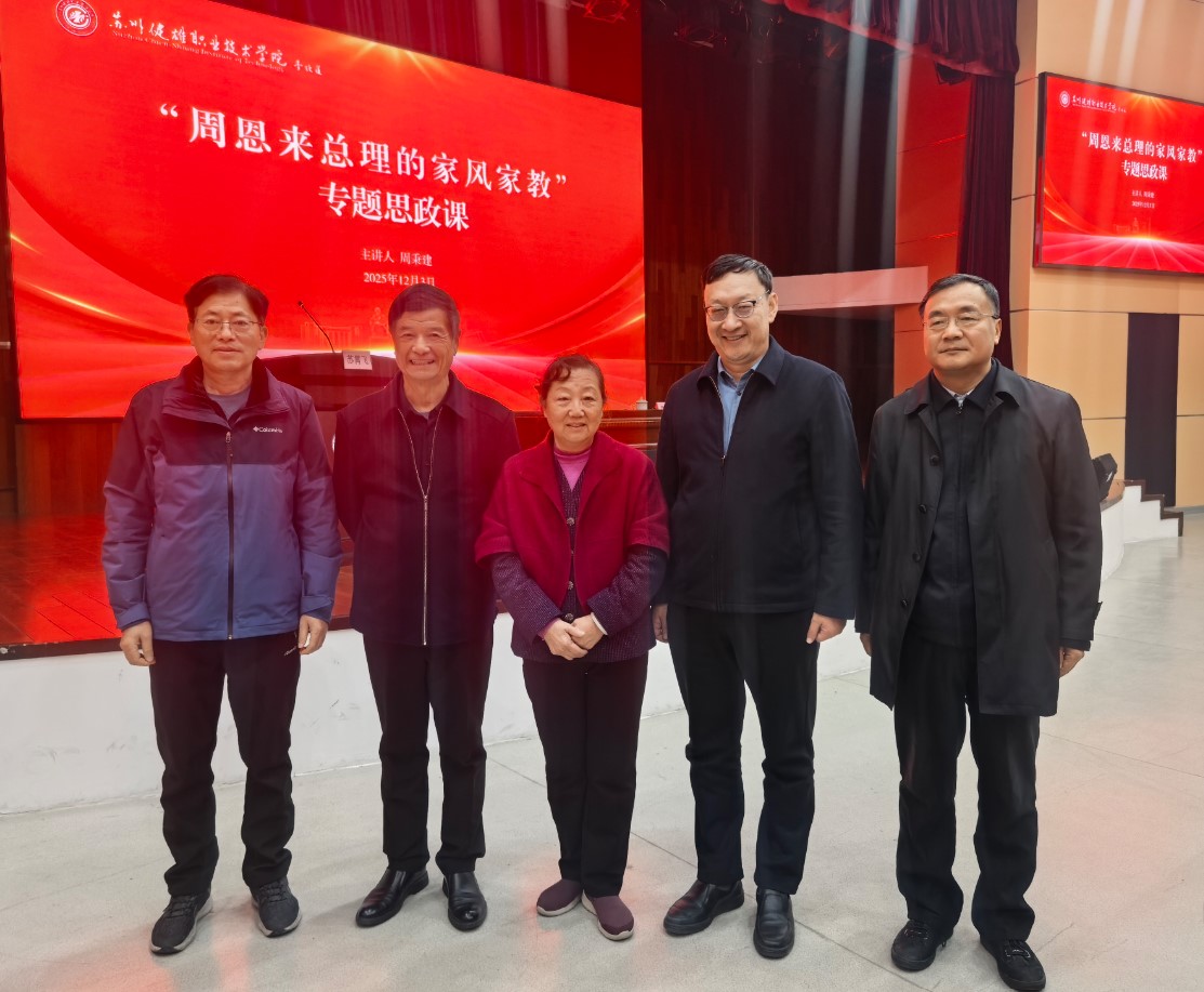 11月23日下午,由太仓市关工委、苏州健雄职业技术学院、国强老党员工作室联合特邀,周恩来总理的侄女周秉建同志作“我崇敬的伯父 我爱戴的总理”廉洁家风报告会,在健雄职业技术学院报告厅举行。太仓市关工委主任王国其、副主任毛义明,市“五老”讲师团以及师生代表180人聆听了报告会。苏州健雄职业技术学院党委书记苏霄飞主持报告会。