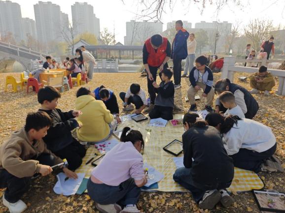 活动最后,分组红色手工制作环节将氛围推向高潮。植物拓印组的孩子们选取鲜红的花瓣与金黄的银杏叶,在绸缎上轻轻敲打,红色的印记与银杏的轮廓相互映衬,一个个独特的“红韵金叶”画像逐渐成型;枯枝环创组的孩子则用收集的枯枝编织成环,再点缀上红色的丝带和银杏叶,制作出寓意“红色守护”的装饰环。