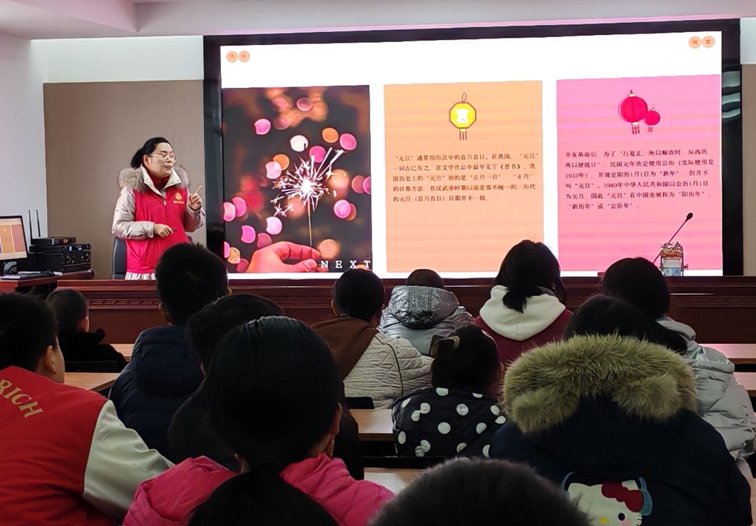 志愿者通过生动有趣的PPT讲解和互动问答,向孩子们介绍了元旦的来历与文化意义。从古代“元日”的起源到现代元旦的确定,从世界各国庆祝元旦的不同方式到中国传统新年习俗的对比,孩子们听得津津有味。一位小朋友兴奋地表示:“原来元旦有这么悠久的历史,我还以为只是简单的‘新年第一天’呢!”