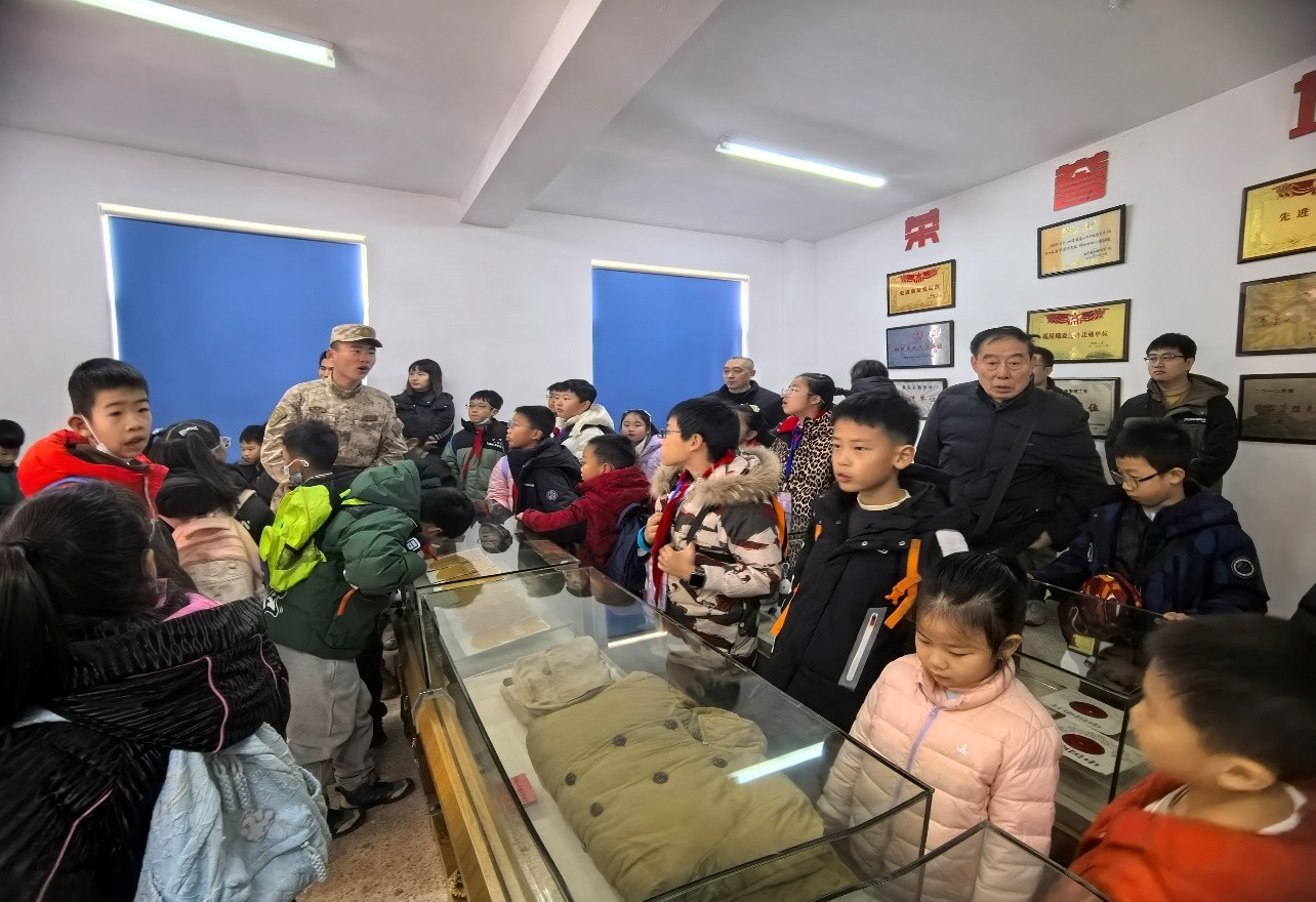 接着,同学们走进连队荣誉室。一张张泛黄的老照片、一件件斑驳的实物展品、一个个振奋人心的荣誉故事,无声诉说着部队的光辉历程与优良传统。连队沈指导员介绍了“团结巩固连”在参加临汾战役以及进军大西北的几十次战斗中的光辉战绩。同时结合展品、图片,生动讲述了部队在训练演习、大项比武、抢险救灾、支援地方建设等任务中涌现的感人事迹,让同学们深刻体会到军人肩上的责任与担当。